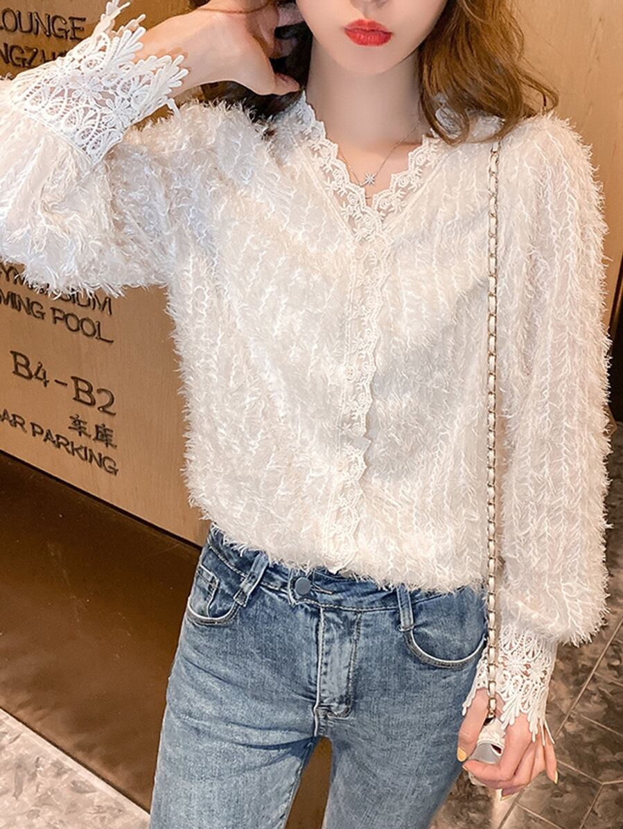 【韓国通販 dgo】Vネック レース シフォンシャツ 2020 春 長袖 女性
