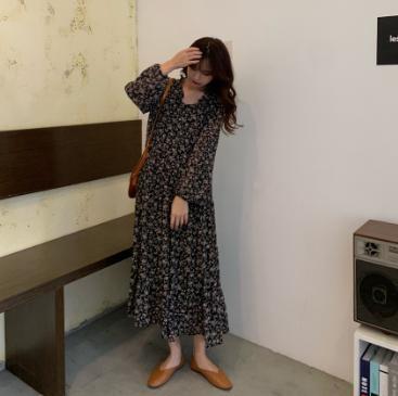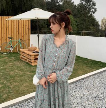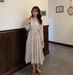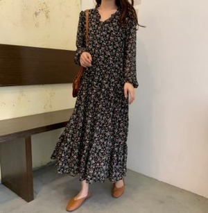 【韓国通販 dgo】シフォン ワンピース 2020 春 ドレス Vネック ロングスカート 長袖 女性 着回し力抜群なワンピース