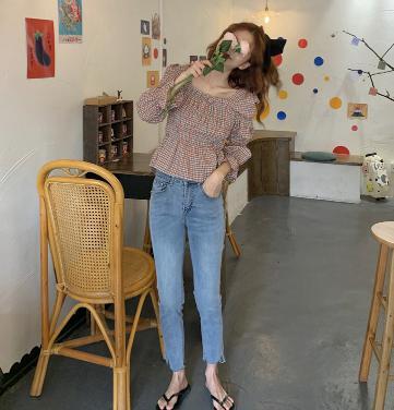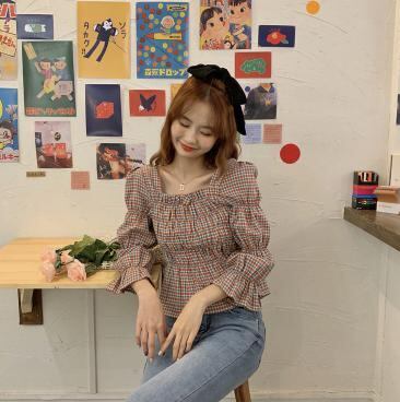 【韓国通販 dgo】チェック柄 シャツ トランペットスリーブ 女性 レトロ 夏 春 2020 春が楽しくなるシャツ