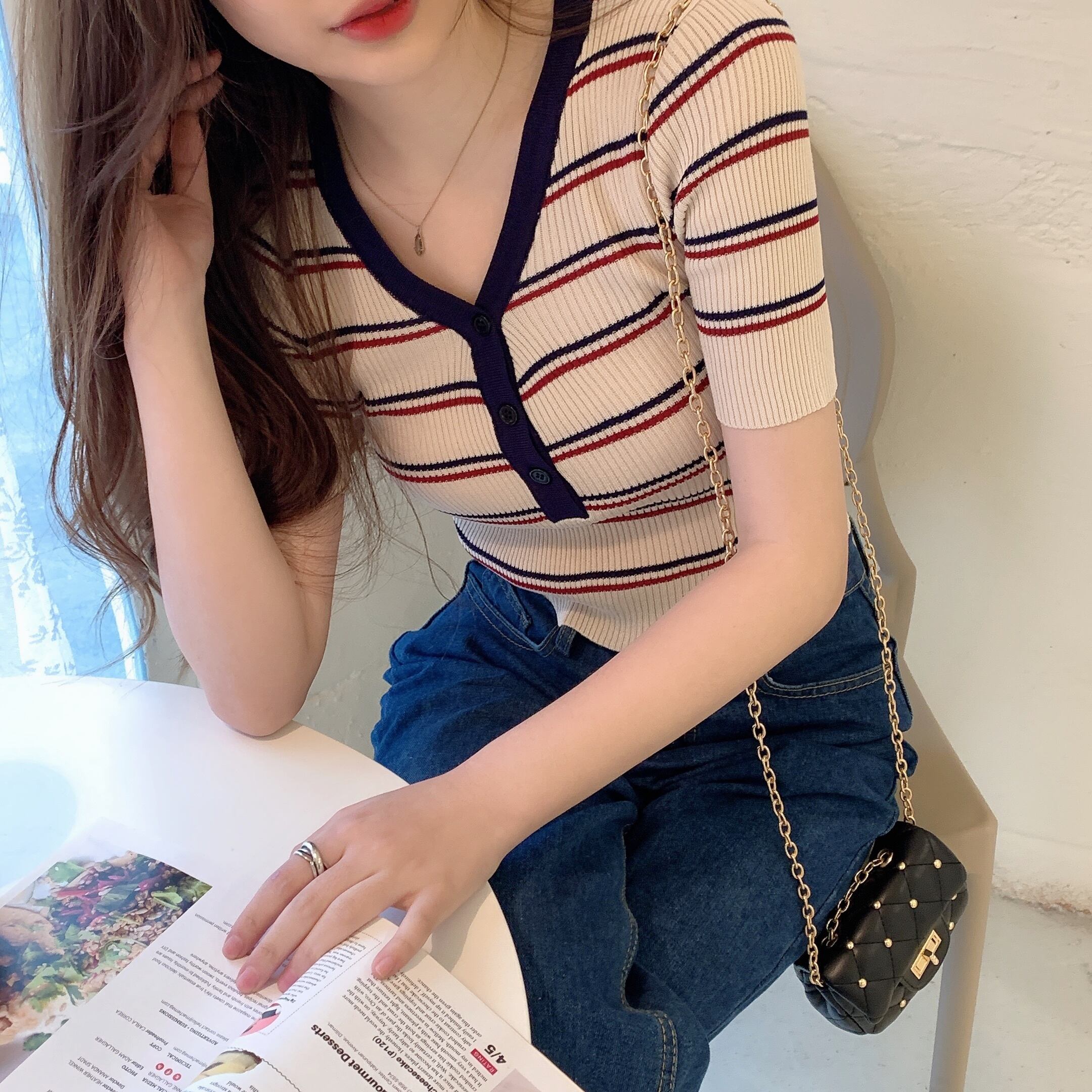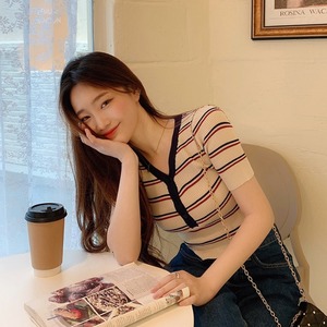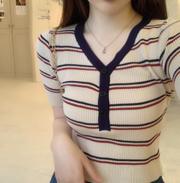 【韓国通販 dgo】レインボーストライプ ボトムスシャツ Vネック スリム ファッション レディース 2020 夏 春