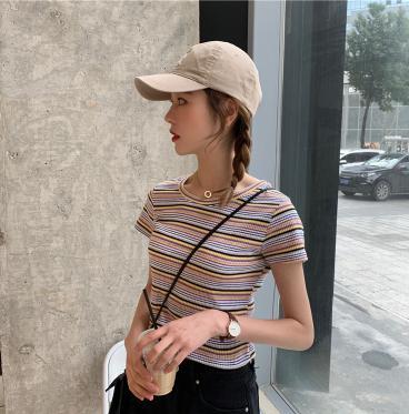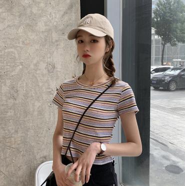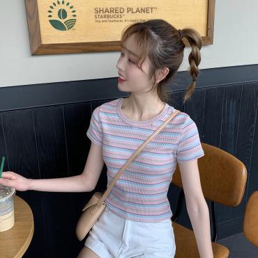 【韓国通販 dgo】2020年 春 ストライプ スリムショート Tシャツ 半袖 レディース