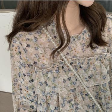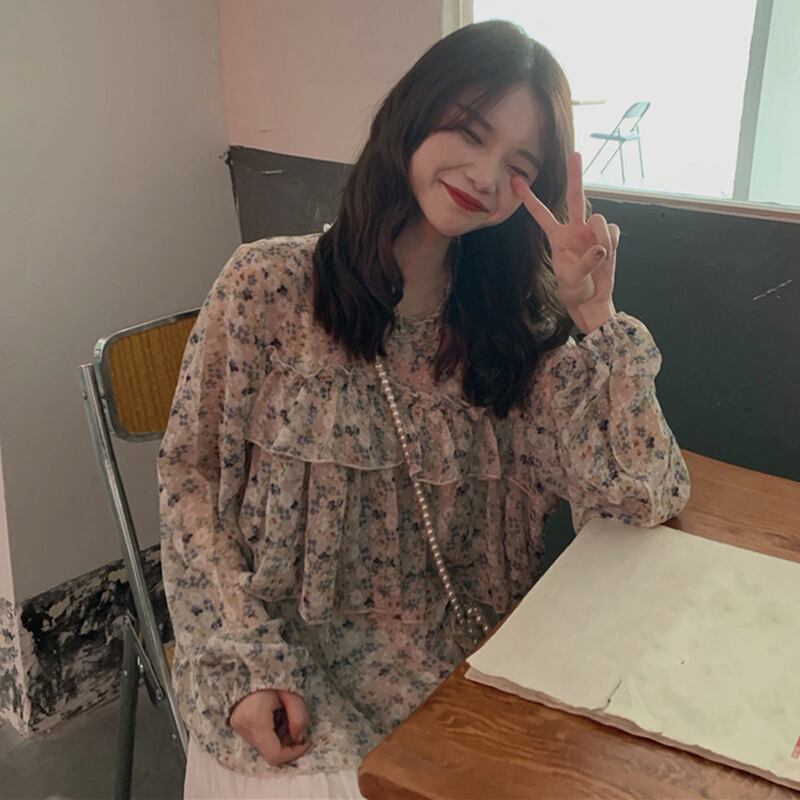 【韓国通販 dgo】フリル フラワーシフォン シャツ レトロ 長袖 2020 春 女性 プルオーバー
