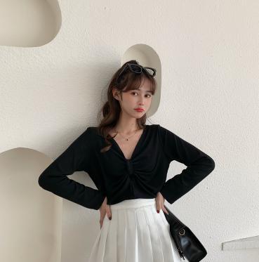 【韓国通販 dgo】2020 夏 春 コットンシャツ 長袖 Tシャツ 女性 Vネック 無地 ファッション