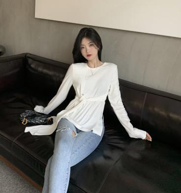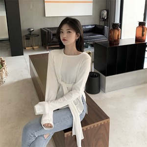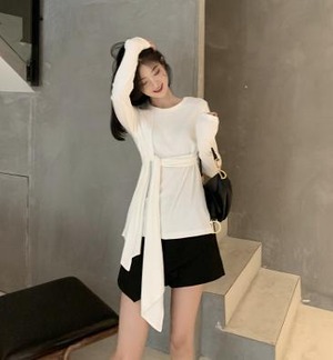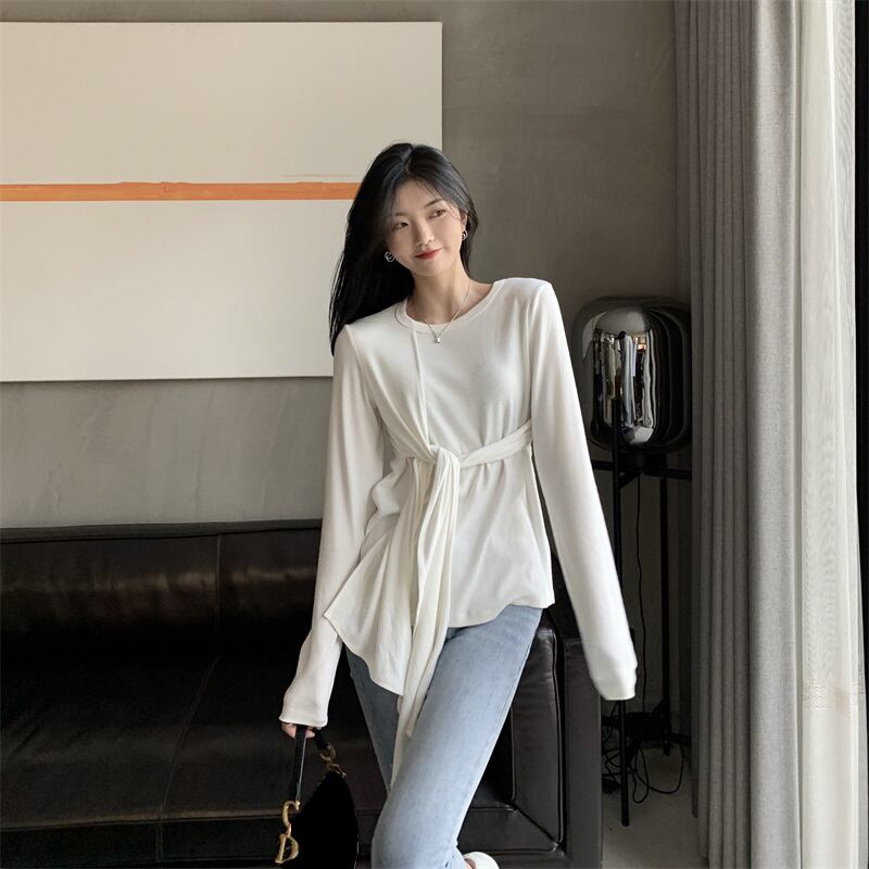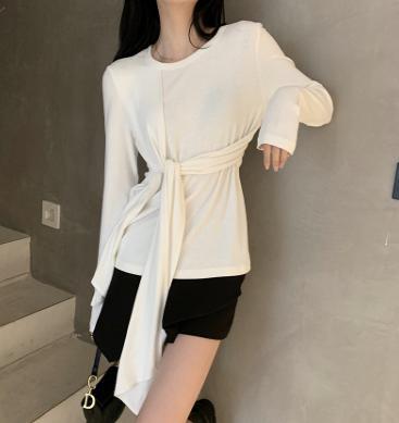 【韓国通販 dgo】レースアップ 長袖 Tシャツ 女性 春 2020 春 ラウンドネック ダークグレー ホワイト
