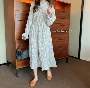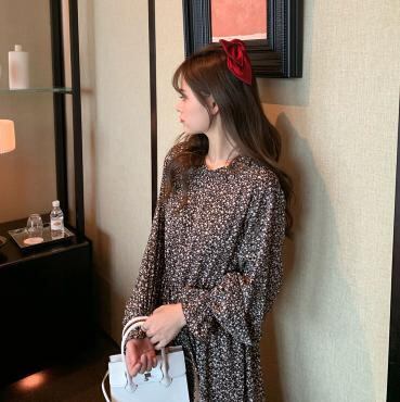 【韓国通販 dgo】花柄 シフォン 長袖 ワンピース 女性 春 夏 2020 ハイウエスト ミドル丈 Aラインスカート