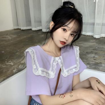 【韓国通販 dgo】夏 春 2020 レトロレース 女性 フリルルーズ半袖トップ バイオレット ブラック