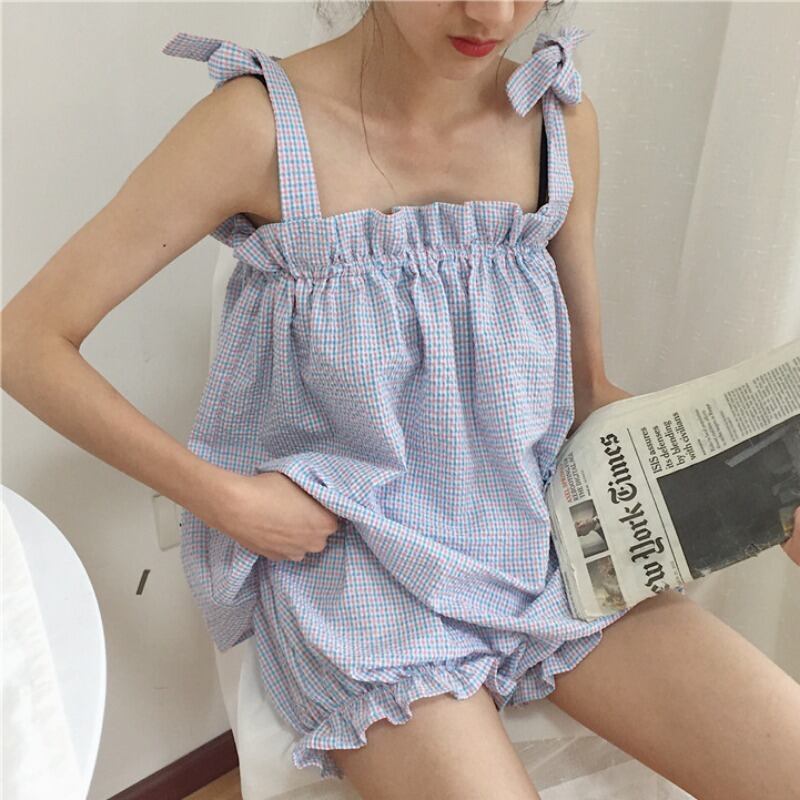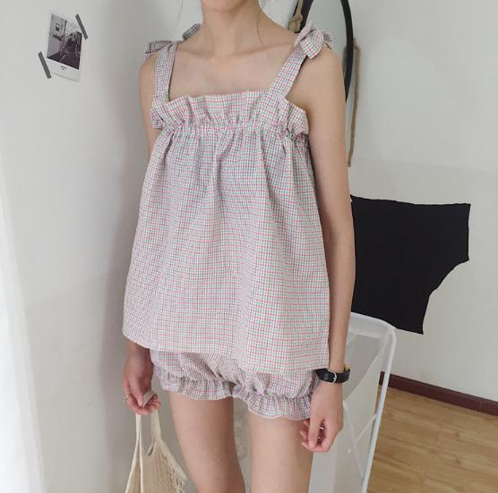 【韓国通販 dgo】パジャマ 夏 女性 かわいい格子縞 カジュアル ショーツ ノースリーブ ルームウェア