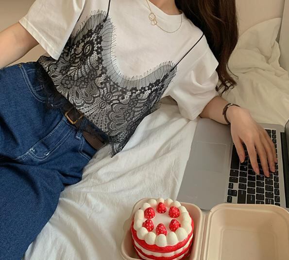 【韓国通販 dgo】半袖 2020 女性 夏 春 レースステッチ ツーピース Tシャツ 底入れシャツ ラウンドネック