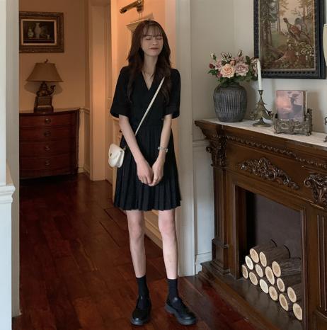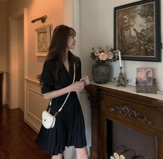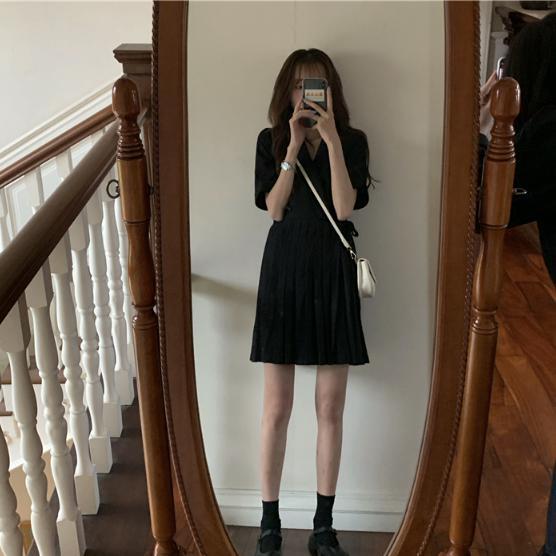 【韓国通販 dgo】ハイウエスト ショートスカート ワンピース 春 夏 2020 半袖 無地 ドレス ダブルブレスト Aライン