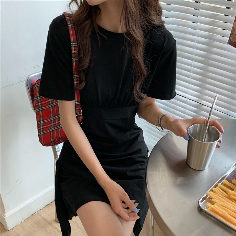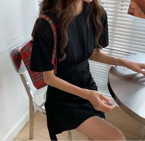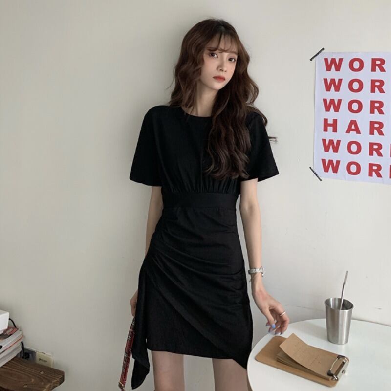【韓国通販 dgo】ハイウエスト ワンピース 女性 2020 夏 ドレスフレンチニッチ 半袖 ショートスカート グレー ブラック 無地
