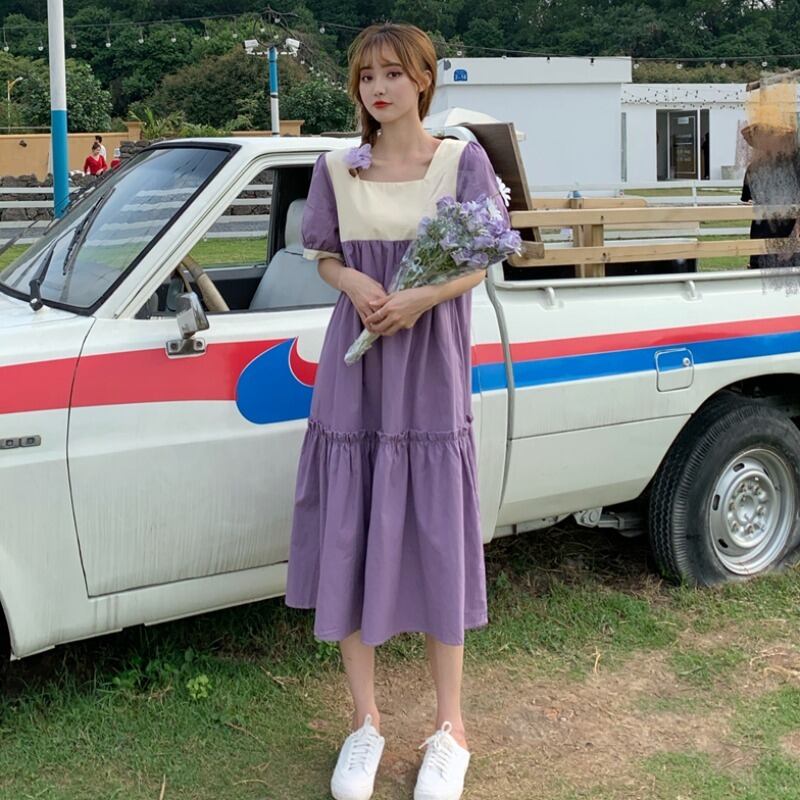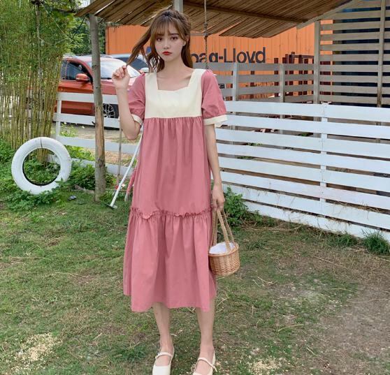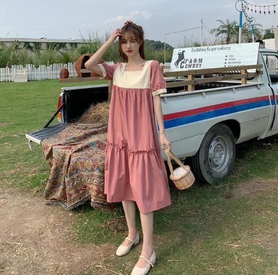 【韓国通販 dgo】スクエアカラー フレンチニッチ ワンピース 半袖 ルーズドレス 女性 2020 夏のドレス
