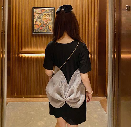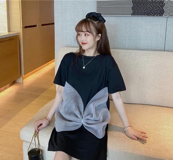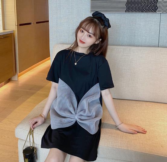 【韓国通販 dgo】リボン付きワンピース 2020新 夏 ラウンドネック ゆったりウエスト Aラインスカート