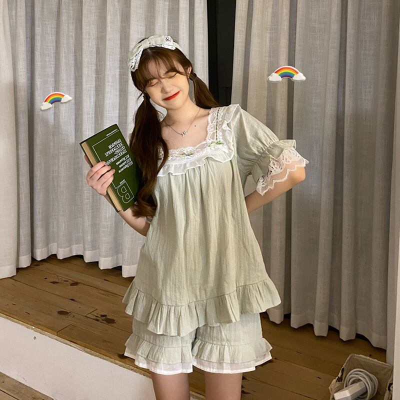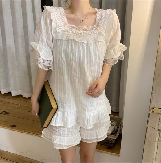 【韓国通販 dgo】2020年 夏 カジュアル ルームウェア 女性 レース 半袖パジャマ ツーピース 綿