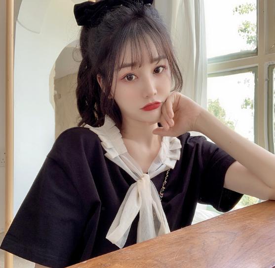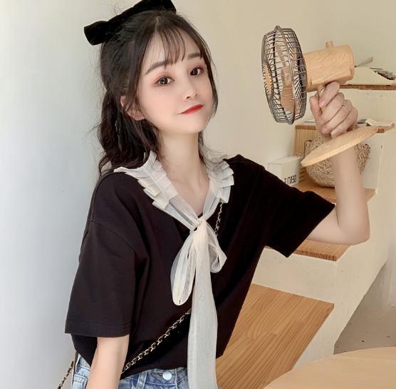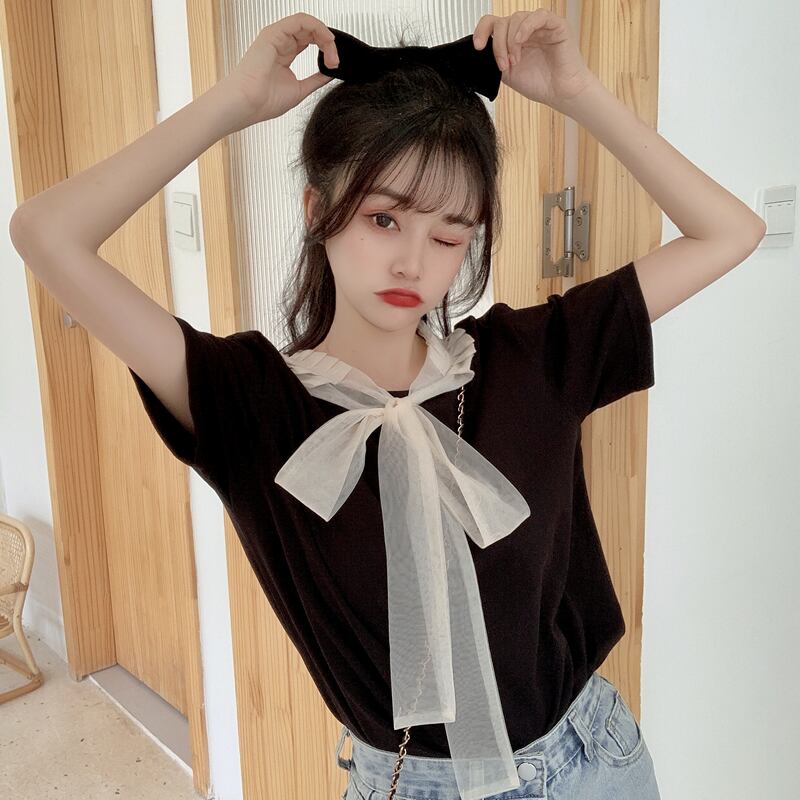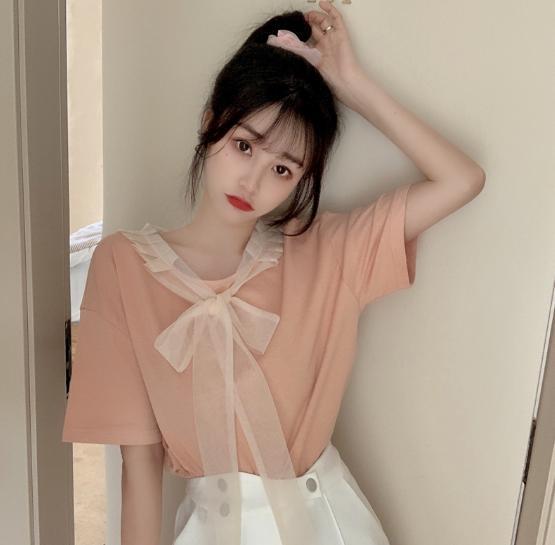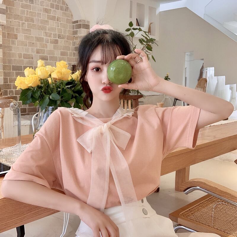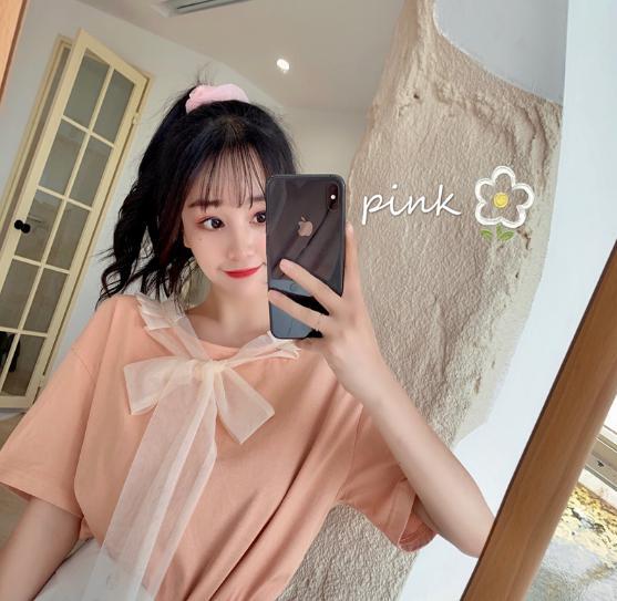 【韓国通販 dgo】メッシュスプライシングボウ 半袖Tシャツ 2020年 夏 レディース ブラック ピンク