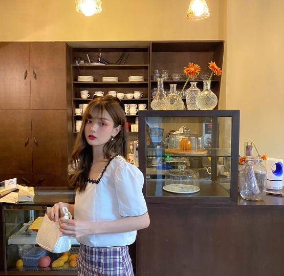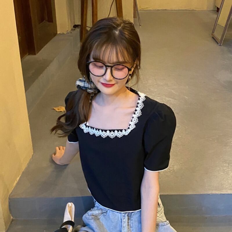 【韓国通販 dgo】スクエアカラー 半袖トップス レトロ 2020年 夏 女性 ブラック ホワイト