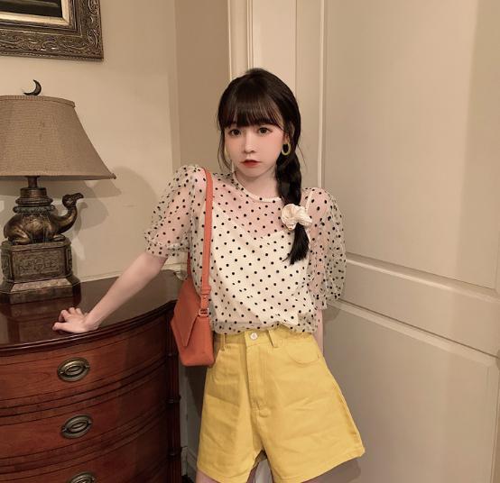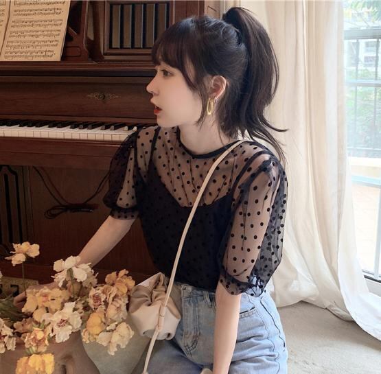 【韓国通販 dgo】2020年 夏 新作 ボトムスシャツ メッシュガウン 半袖ストラップ ツーピース バブルスリーブ 次に欲しい!シースルー