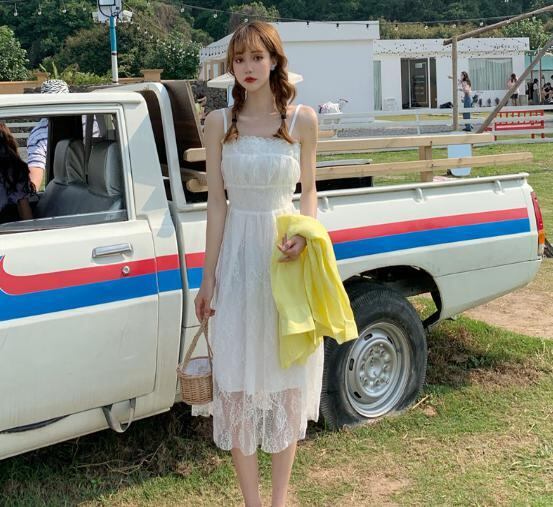 【韓国通販 dgo】スウィートメッシュ ワンピース ドレス 女性 夏 2020 サスペンダー ハイウエスト ノースリーブ 次に欲しい!シースルー