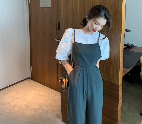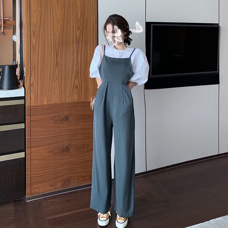 【韓国通販 dgo】ハイウエスト ワイドレッグ サスペンダー パンツ オールインワン 夏 女性 2020