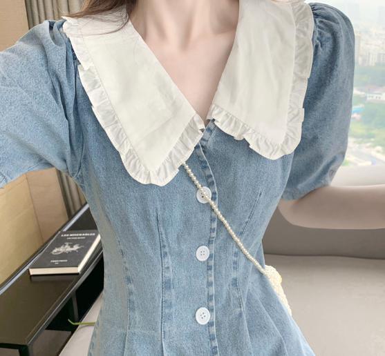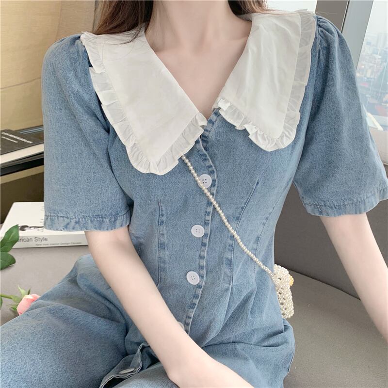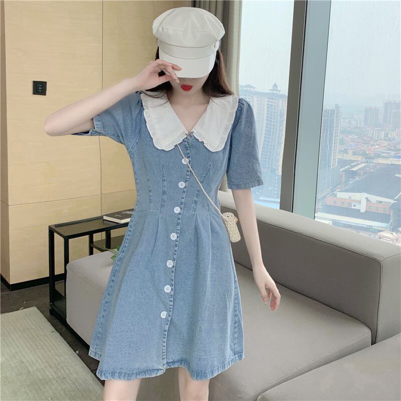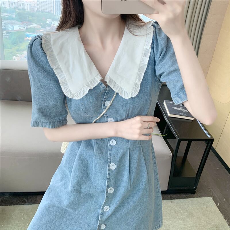 【韓国通販 dgo】ハイウエスト デニム ワンピース 夏 女性 2020 レトロ 半袖 ドレス
