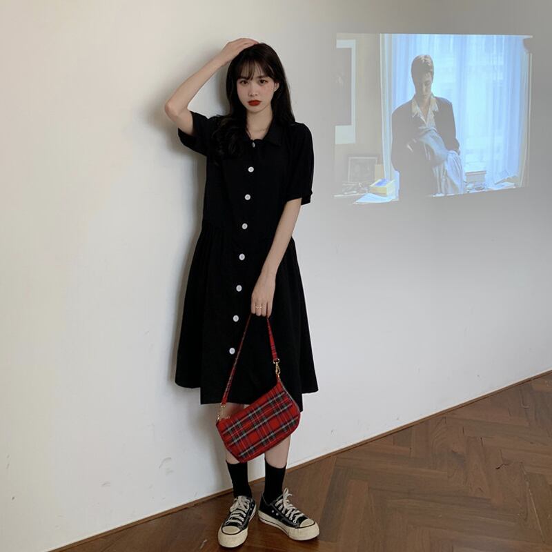 【韓国通販 dgo】シングルブレスト ワンピース ドレス 女性 夏 2020 フレンチニッチ ミドル丈 Aライン