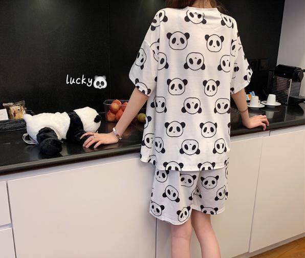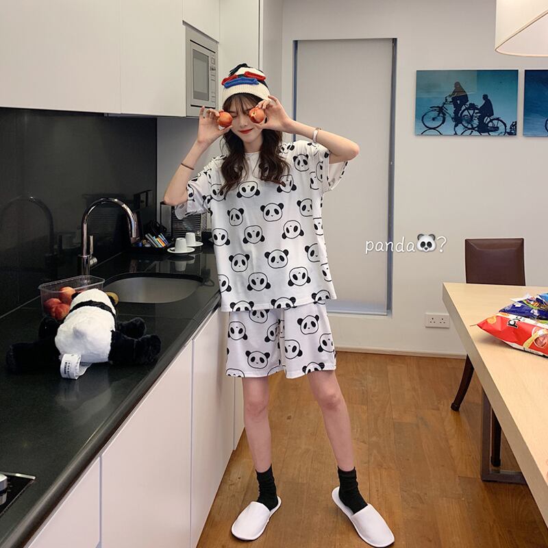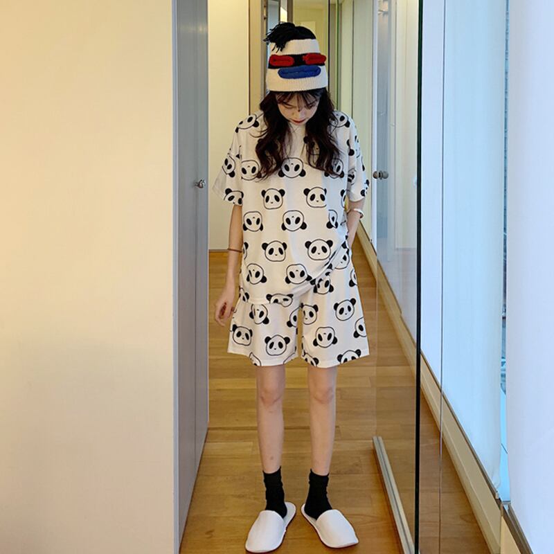 【韓国通販 dgo】ルームウェア パジャマ 女性 夏 2020年 ツーピース 半袖 リラックスコーデ パンダ ラウンドネック
