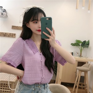 【韓国通販 dgo】レースステッチ 半袖 シフォンシャツ トップ レディース 夏 2020 スリム(A1874)
