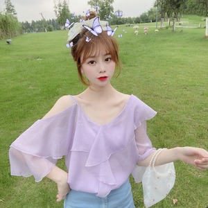 【韓国通販 dgo】2020年 夏 新作 フリル オフショルダー Vネック 半袖 シフォンシャツ トップス 気分高まる♪夏のシャツ(A1800)