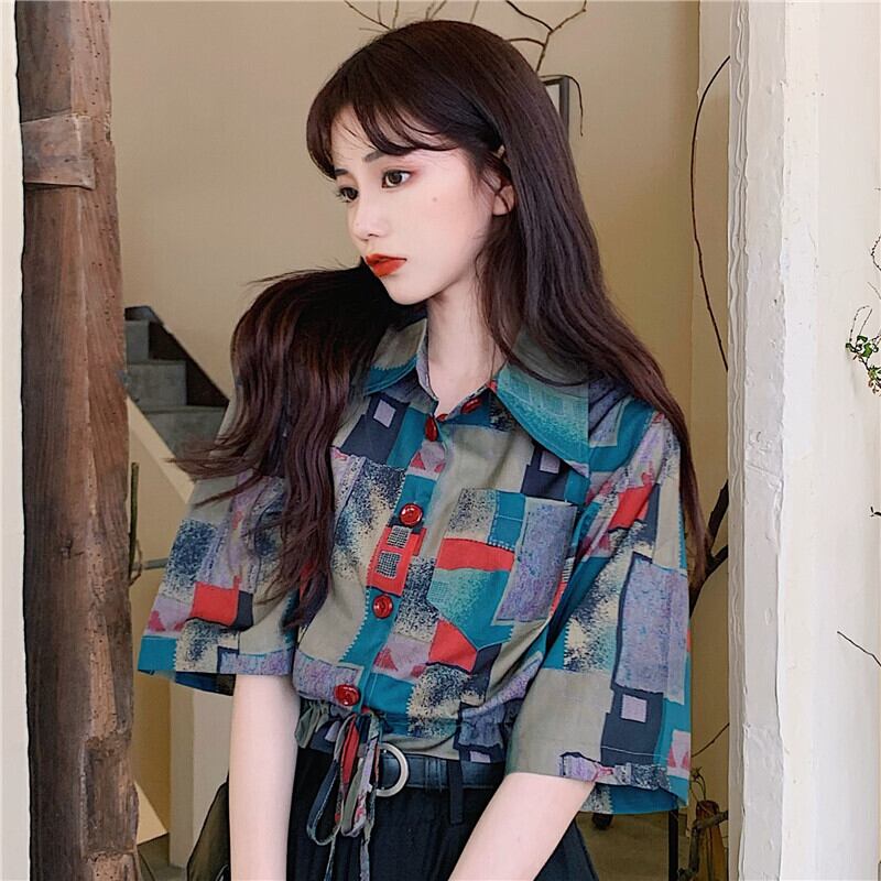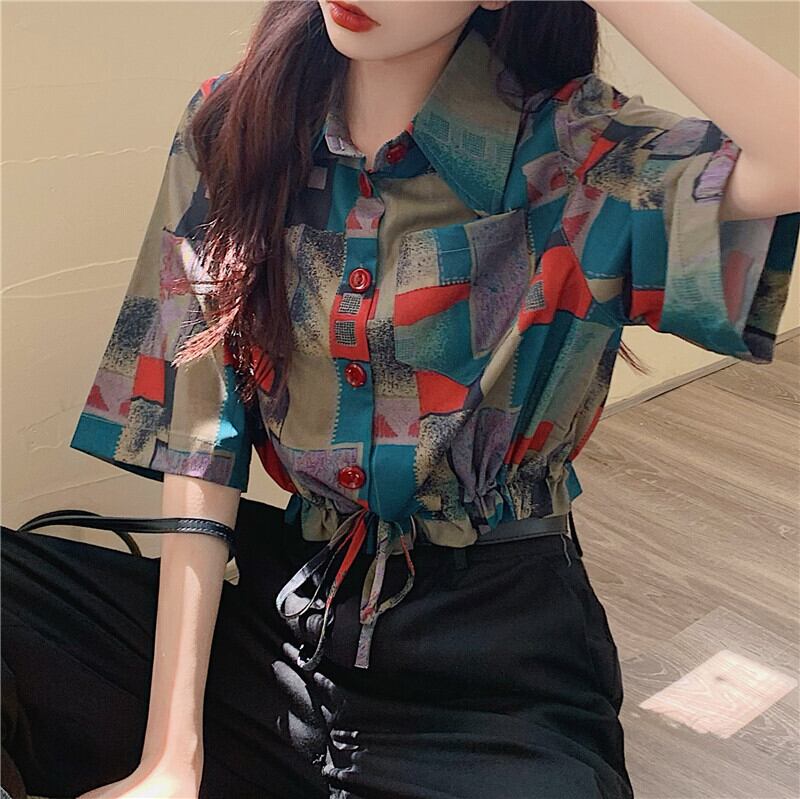 【韓国通販 dgo】ショート ドローストリング シャツ 半袖 レトロ デザインニッチ 2020 夏 個性輝くこだわりトップス(A1712)