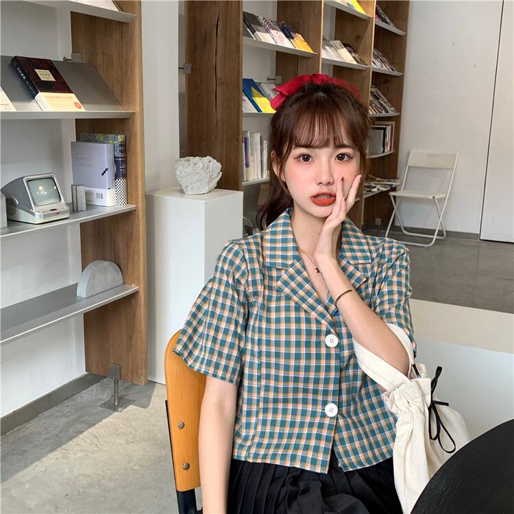 【韓国通販 dgo】半袖 チェック柄 半袖 シャツ 女性 2020年 夏 カレッジスタイル 個性輝くこだわりトップス(A1709)