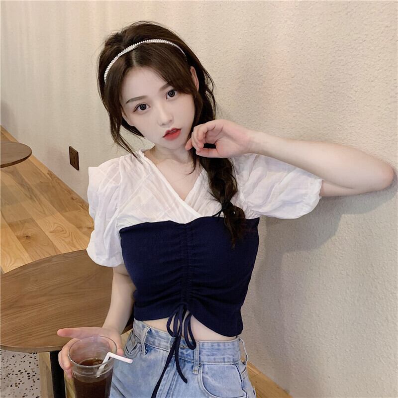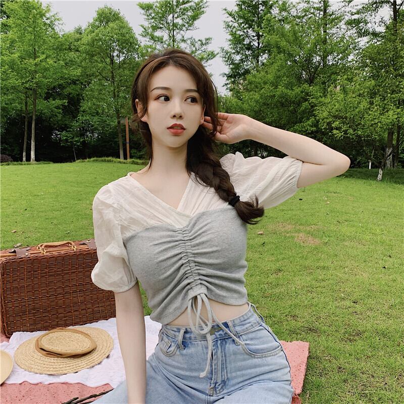 【韓国通販 dgo】Vネック 半袖シャツ 女性 ショートトップ 2020年 夏 愛らしいトップス(A1691)