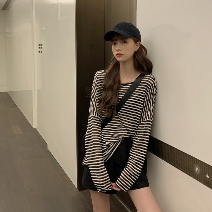 【韓国通販 dgo】バッククロス ミドル丈 ストライプ 長袖 Tシャツ 女性 2020年 夏 さらっと一枚で。涼しいTシャツ(A1683)