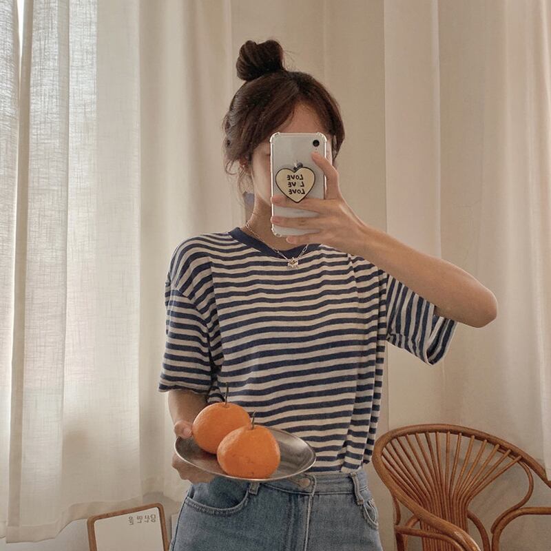 【韓国通販 dgo】ストライプ 半袖 Tシャツ 女性 ラウンドネック 夏 2020 デザインセンス スタイリッシュ 一着あると便利なトップス(A1673)