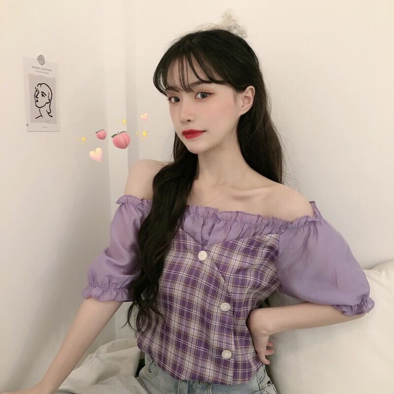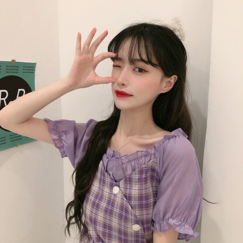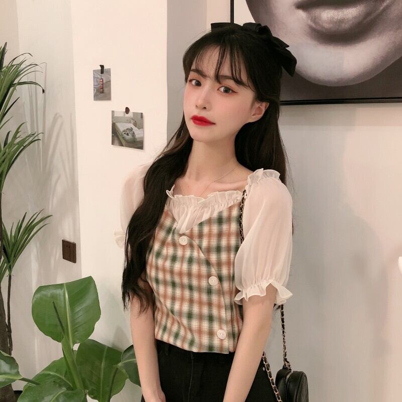【韓国通販 dgo】レトロ チェック柄 フェイクツーピース シフォンシャツ 女性 夏 2020 半袖 一着はマスト♪夏のシャツ(A1630)