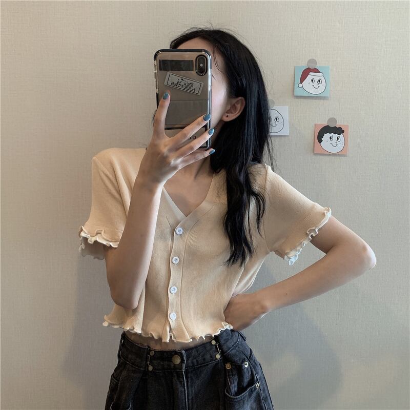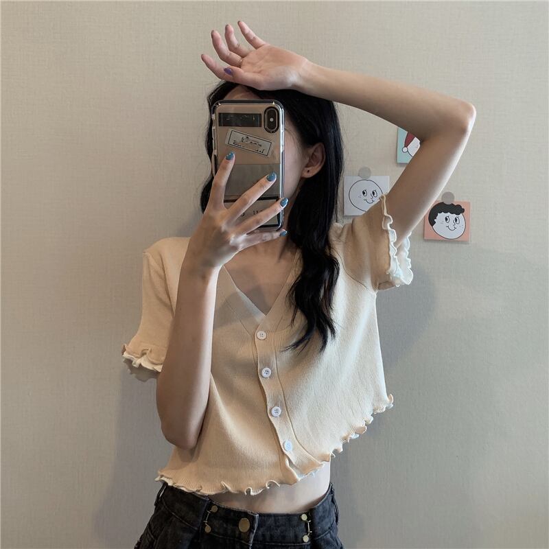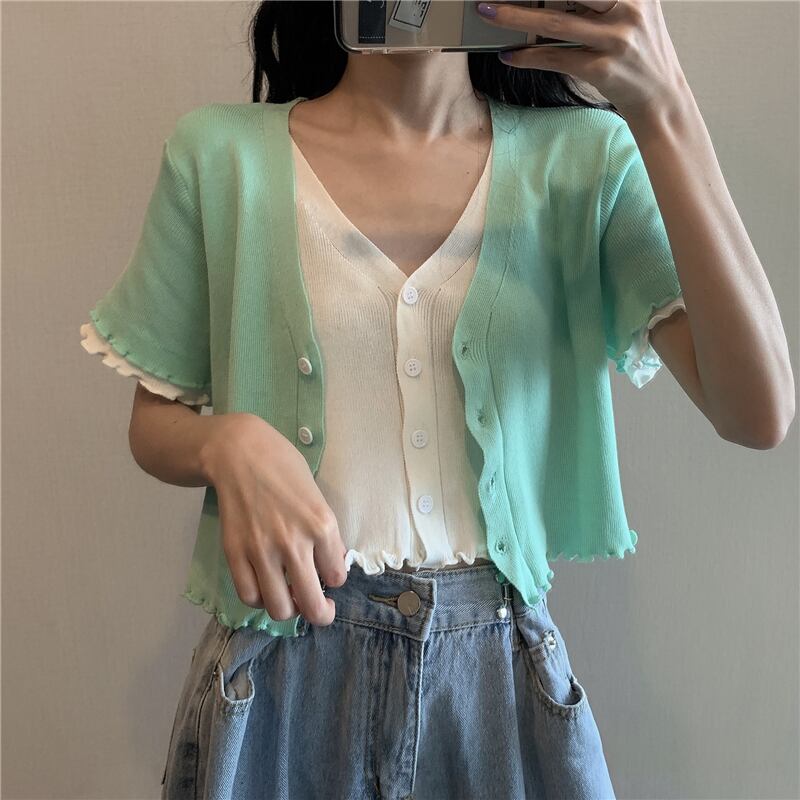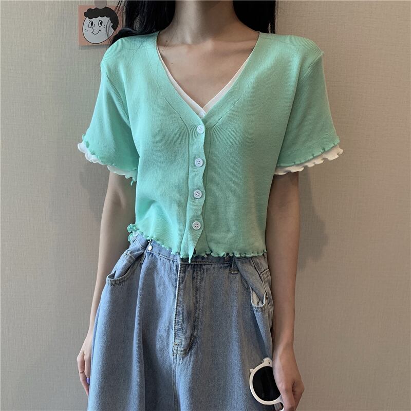 【韓国通販 dgo】2020年 夏 フェイクツーピース 半袖カーディガン セーター 女性 シングルブレスト 夏が楽しくなるサマーニット (A1588)