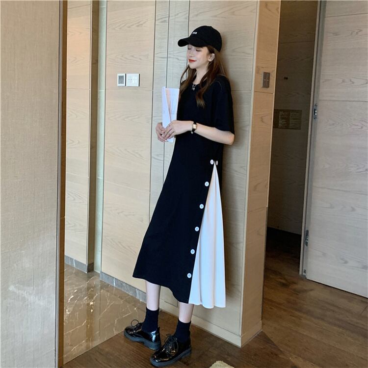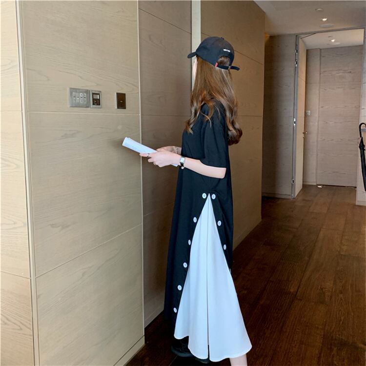 【韓国通販 dgo】シフォンステッチ ワンピース ドレス 女性 ブラック ゆったりウエスト ラウンドネック 2020年 夏 「ロングワンピース」でイメチェン(A1582)