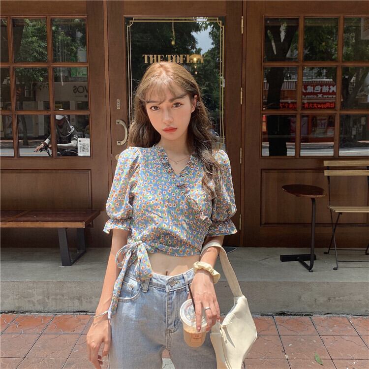 【韓国通販 dgo】Vネック フローラル トップ 半袖 シフォンシャツ 女性 夏 2020年 センス感じるこだわりトップス(A1572)