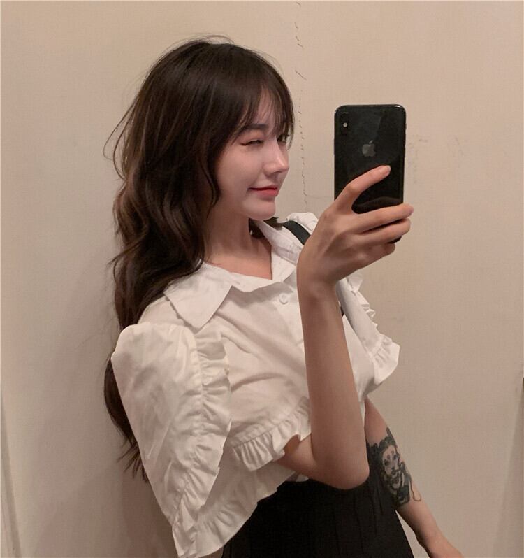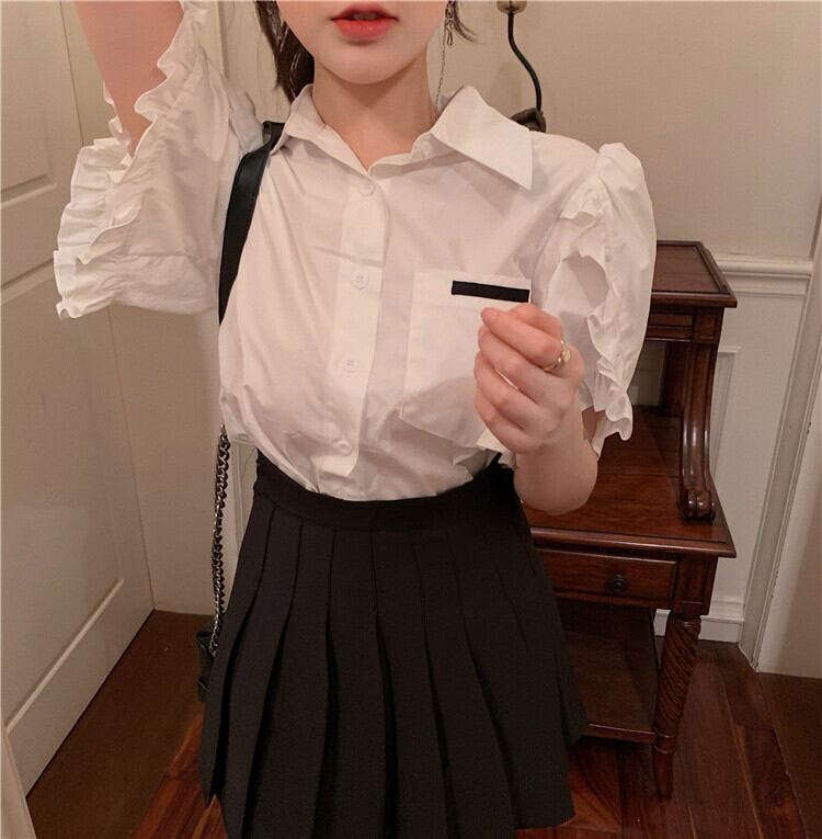 【韓国通販 dgo】レース シングルブレスト 半袖シャツ 女性 夏 2020年 ニッチ ポケット 夏の愛されトップス(A1564)