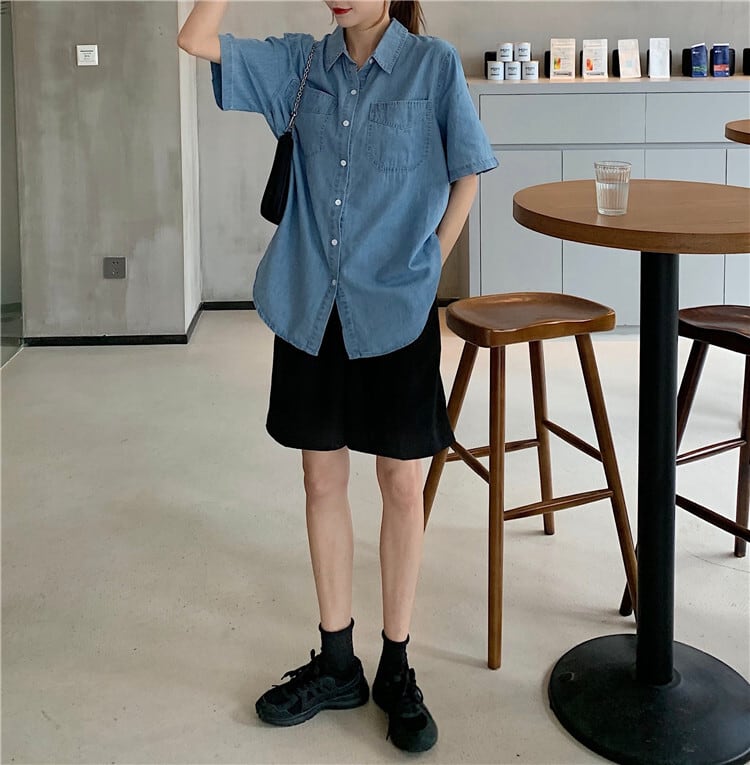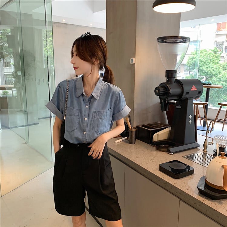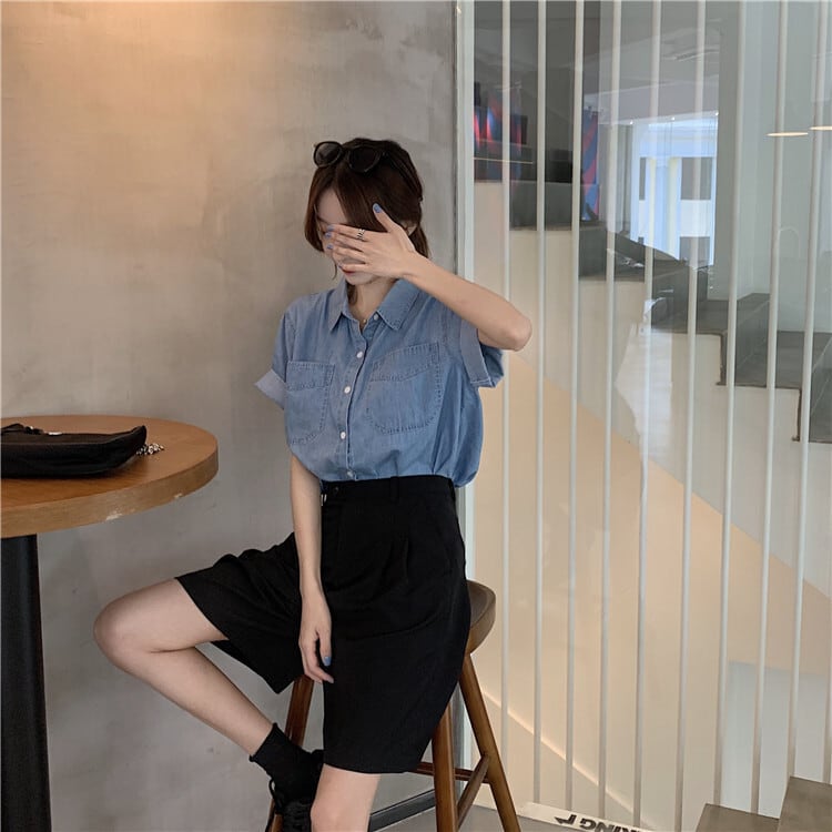 【韓国通販 dgo】POLO襟 デニム シャツ 夏 2020 半袖 女性 ブルー 一枚でサマになる夏のトップス(A1516)