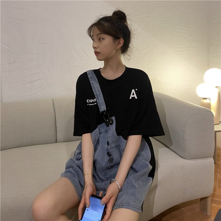 【韓国通販 dgo】半袖 Tシャツ フェイクツーピース デニムステッチ トップ ラウンドネック 女性 2020 ミドル丈(A1504)