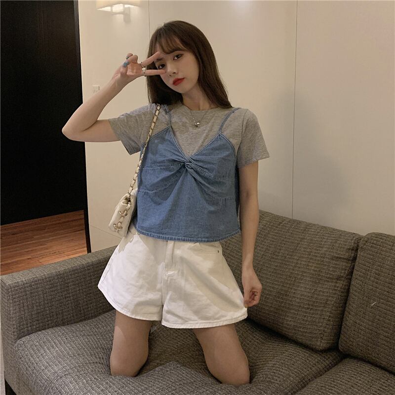 【韓国通販 dgo】半袖 Tシャツ 女性 フェイクツーピース ラウンドネック 2020年 夏 特別な日のトップス(A1496)