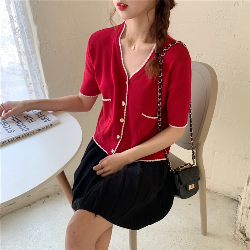 【韓国通販 dgo】Vネック 半袖 カーディガン シングルブレスト セーター 女性 夏 2020年 好感度アップ!レディースの夏コーデ(A1437)