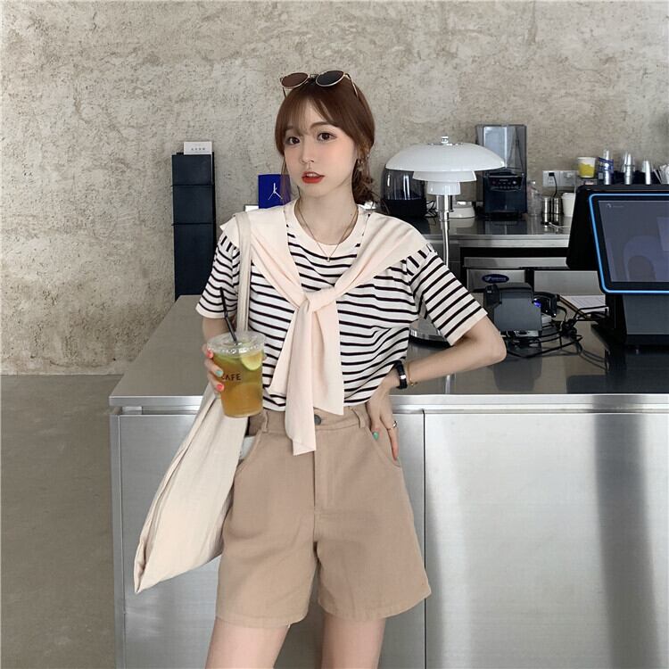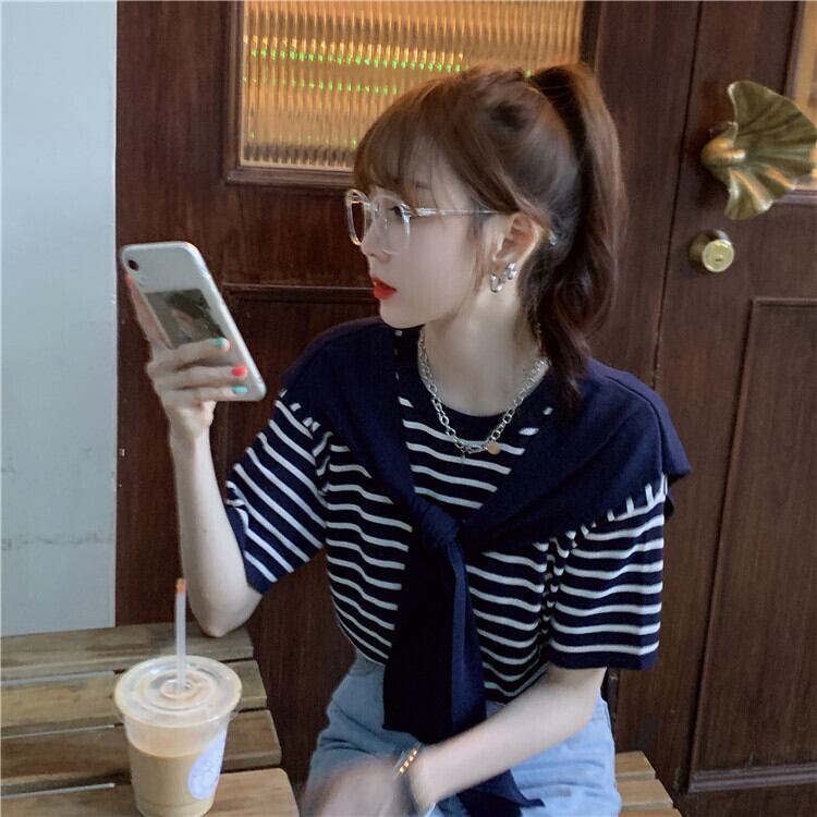 【韓国通販 dgo】ボーダー 半袖 Tシャツ 女性 夏 ショール 2020年 フレンチトップ ローラウンドネック センス感じるこだわりトップス(A1403)