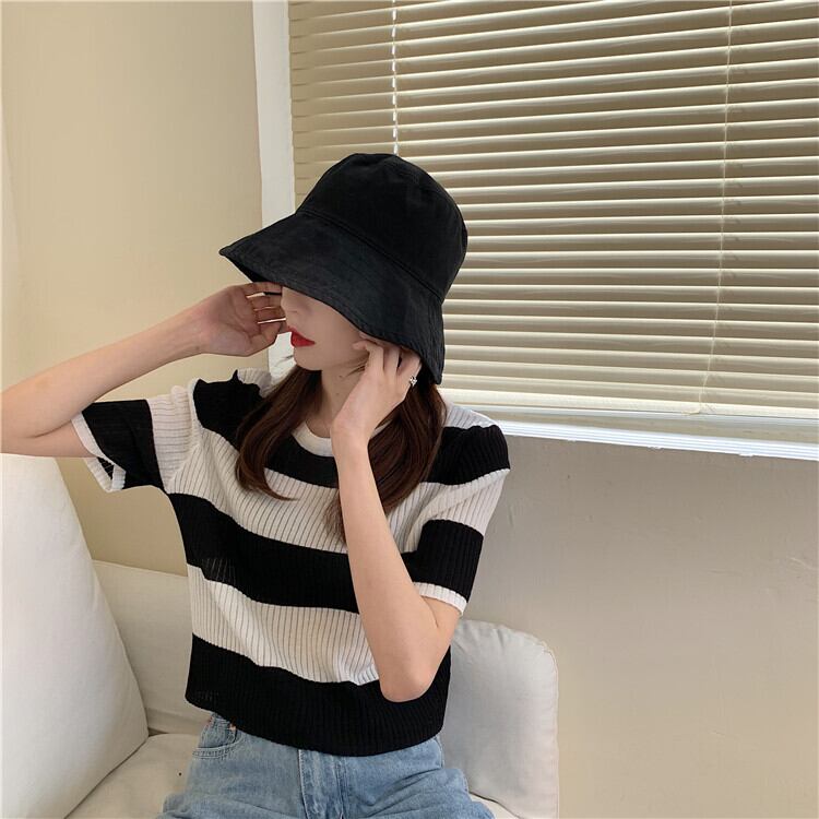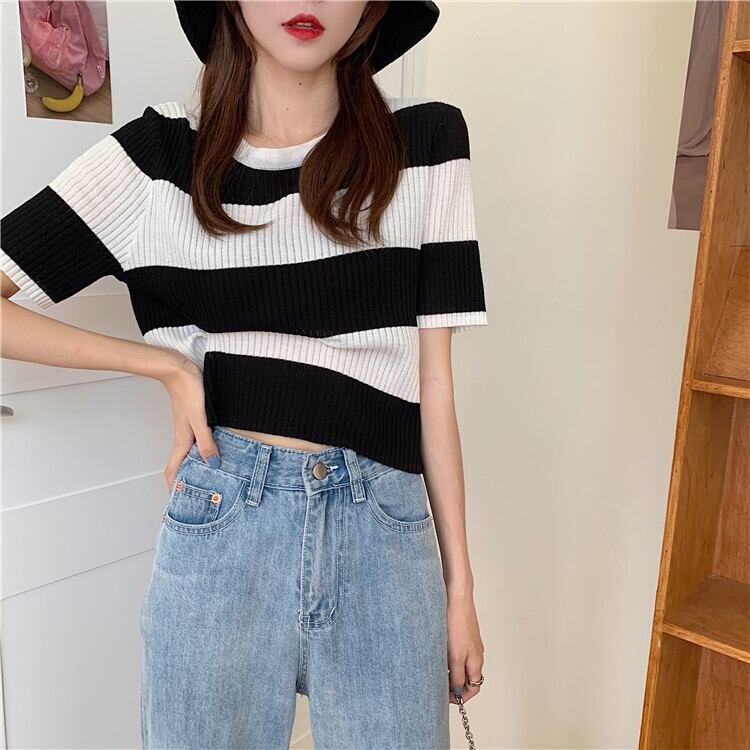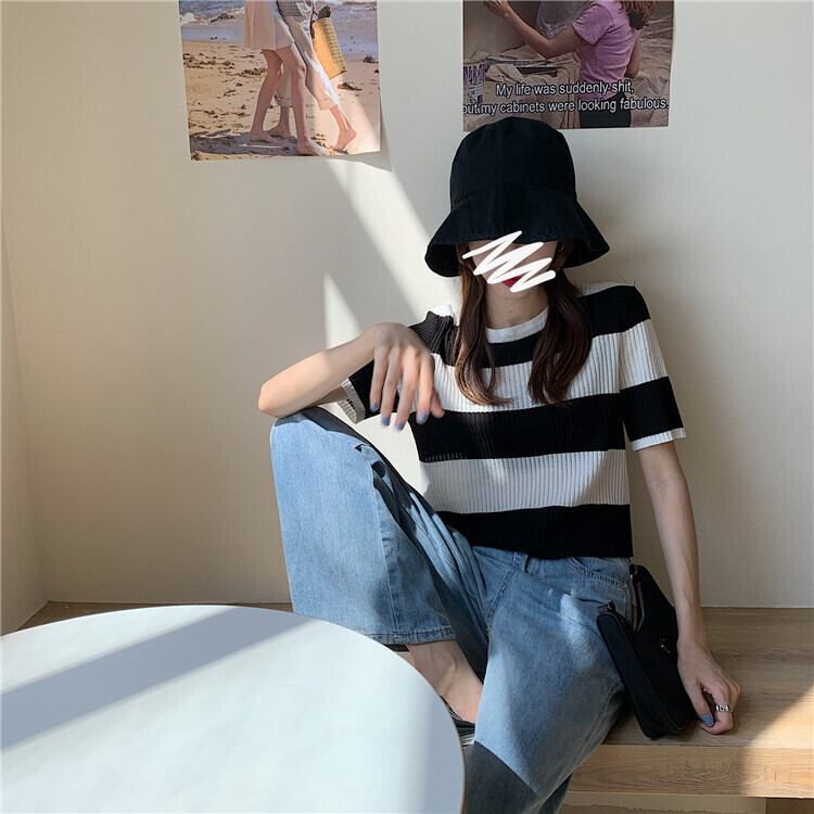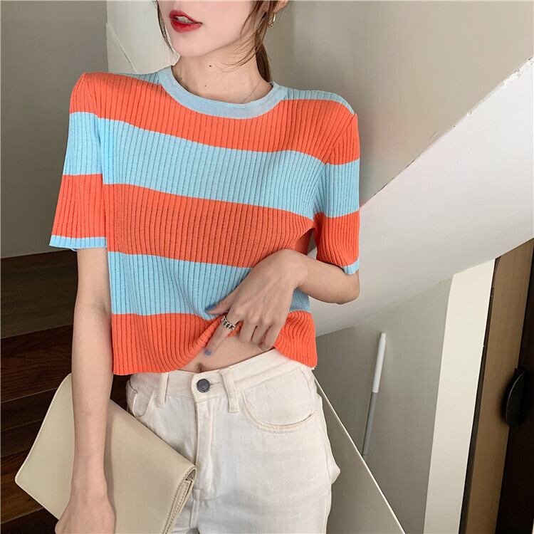 【韓国通販 dgo】2020年 夏 ストライプ 半袖 セーター 女性 ローラウンドネック センス感じるこだわりトップス(A1399)