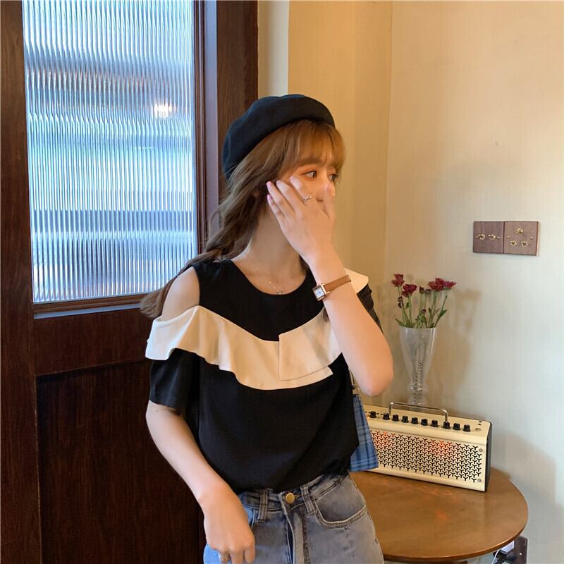 【韓国通販 dgo】シフォンシャツ トップス 2020年 夏 半袖 ラウンドネック オフショルーダー 夏の愛されトップス(A1383)