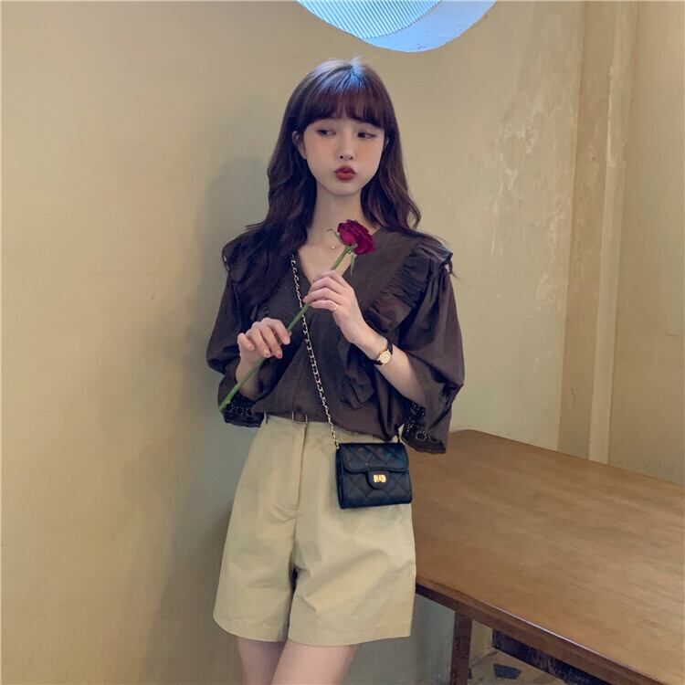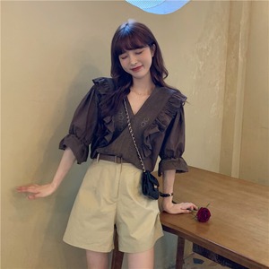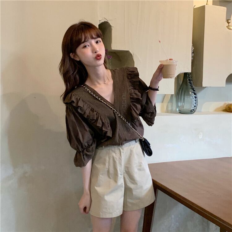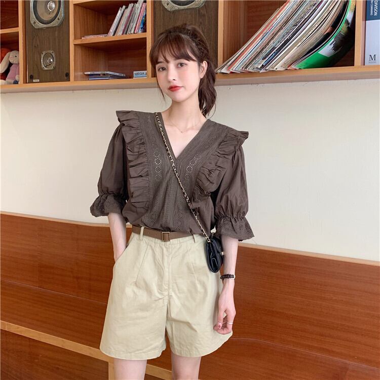 【韓国通販 dgo】フリルデザイン 半袖 ブラウス コーヒーカラー シャツ 女性 夏 2020 夏が楽しくなるトップス(A1359)