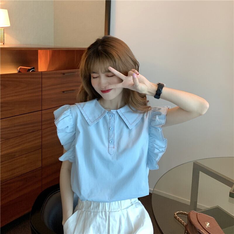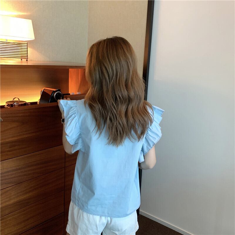 【韓国通販 dgo】フリルデザイン シャツ トップス 半袖 女性 2020年 夏 ブルー(A1333)
