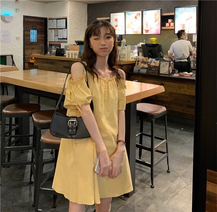 【韓国通販 dgo】パフスリーブ オフショルダー ワンピース ドレス 2020年 夏 Aラインスカート ソリッドカラー(A1311)