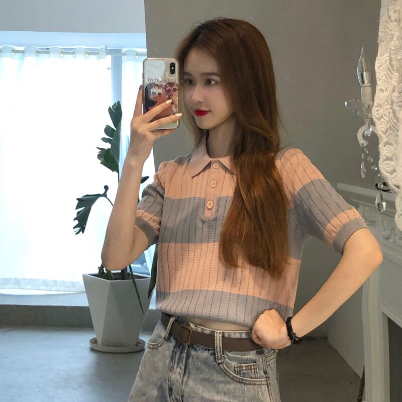 【韓国通販 dgo】ストライプ ポロ襟 半袖 ニット セーター 女性 2020年 夏 (A1301)