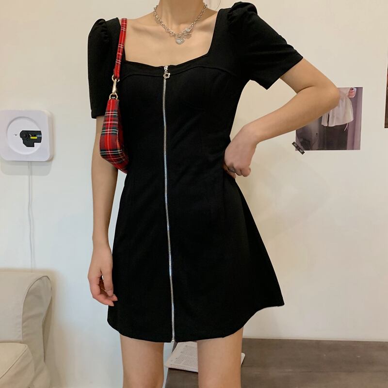 【韓国通販 dgo】レトロ ブラック スクエアカラー ワンピース ドレス 夏 2020 ハイウエスト Aラインスカート 夏が楽しくなるワンピース(A1279)