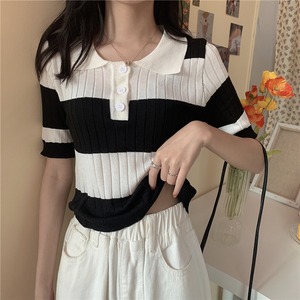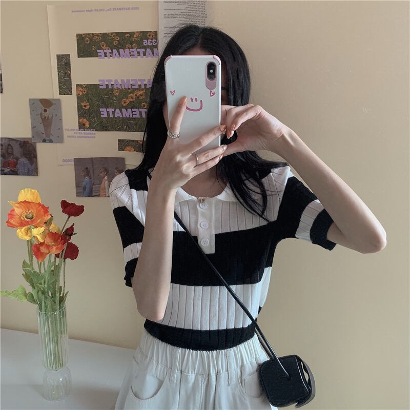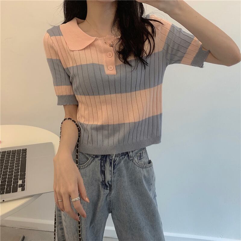 【韓国通販 dgo】ストライプ プルオーバートップ 夏 2020年 半袖 セーター 女性 落ち着きシャツコーデ(A1249)
